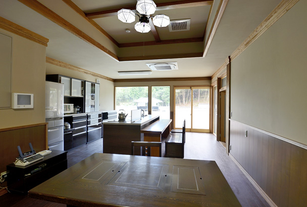 大勢で集い、語らうには最適の広い洋室。窓の方へと目を向けると、桃李庵の外に広がる田園風景を楽しめます。階段を降ろせば2階へ上がることもできます。