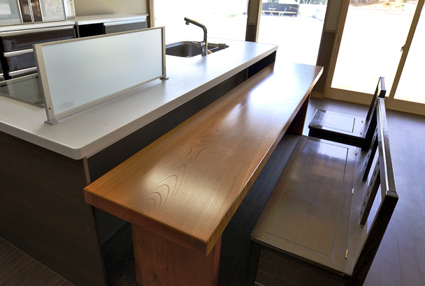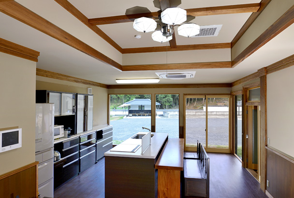 ゆったりしたスペースと、充実した設備が自慢のキッチン。広い窓を通して、庭の様子や東屋、その上に広がる大きな空を臨むこともできます。